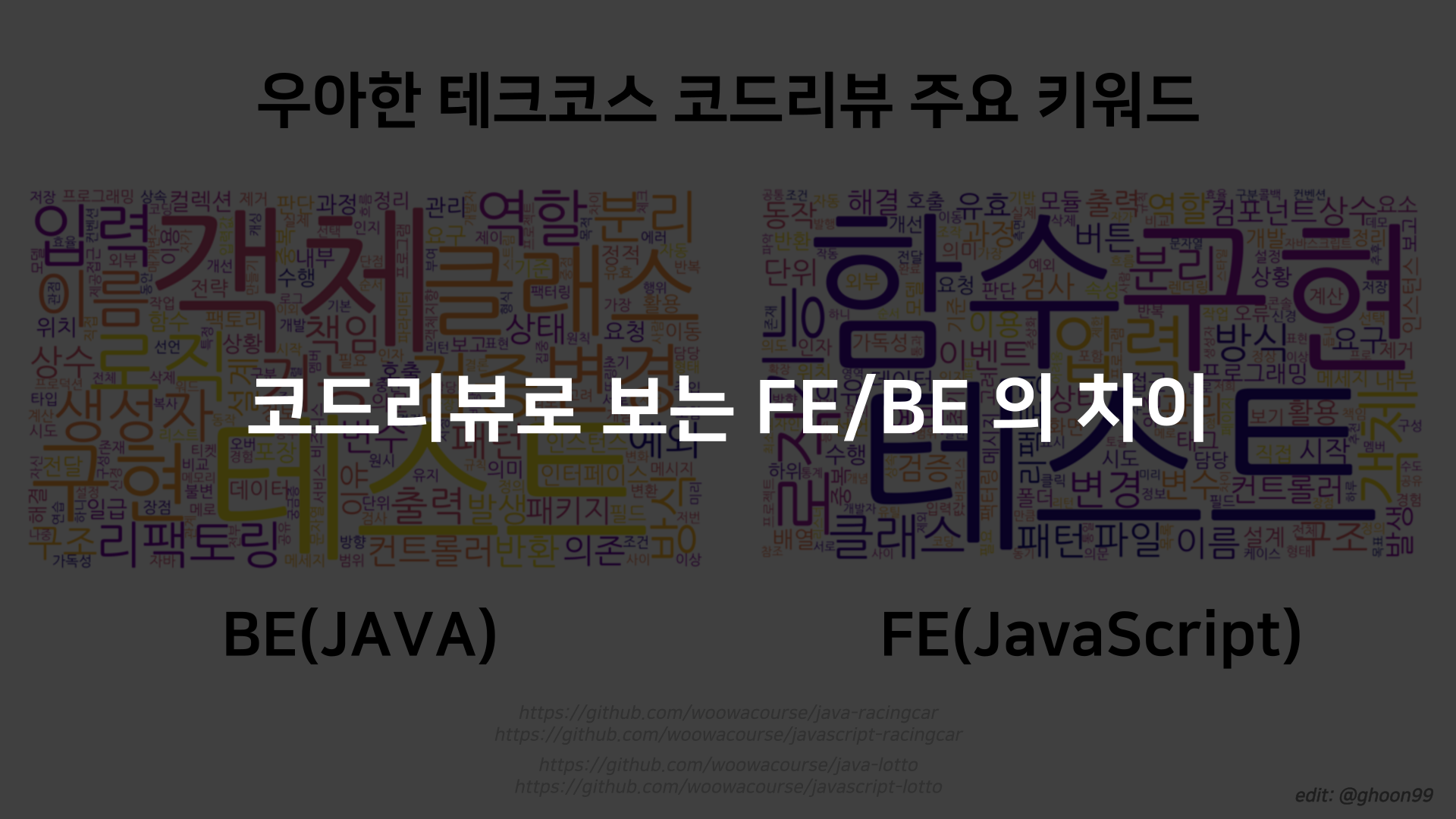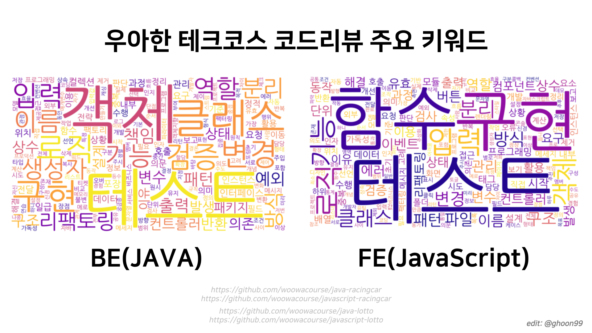 - 자동차 경주와 로또 게임의 PR(BE: 1326개, FE: 659개)과 코드리뷰 코멘트에 등장한 키워드들의 빈도를 분석