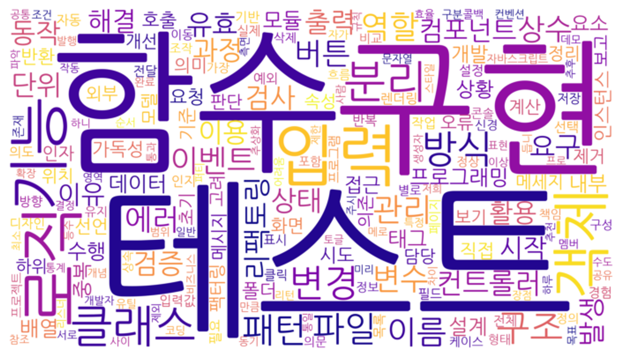 단어 빈도 출력 (상위 100개): [('테스트', 1918), ('함수', 1573), ('구현', 1421), ('입력', 1210), ('로직', 1129), ('기능', 1001), ('객체', 946), ('클래스', 942), ('분리', 937), ('방식', 667), ('변경', 639), ('구조', 588), ('파일', 533), ('패턴', 531), ('이름', 461), ('관리', 449), ('역할', 438), ('이벤트', 414), ('변수', 403), ('버튼', 392), ('에러', 378), ('상수', 377), ('컨트롤러', 354), ('리팩토링', 346), ('단위', 338), ('상태', 337), ('검사', 332), ('유효', 329), ('요구', 326), ('출력', 325), ('검증', 324), ('동작', 313), ('과정', 312), ('이용', 312), ('발생', 311), ('컴포넌트', 300), ('해결', 293), ('활용', 277), ('이유', 276), ('시작', 275), ('프로그래밍', 275), ('모듈', 266), ('데이터', 266), ('배열', 262), ('태그', 261), ('설계', 258), ('수행', 252), ('내부', 251), ('요소', 245), ('상황', 242), ('개발', 236), ('중복', 229), ('접근', 221), ('인스턴스', 215), ('폴더', 210), ('호출', 209), ('시도', 208), ('직접', 206), ('요청', 206), ('반환', 202), ('가독성', 201), ('선언', 192), ('오류', 184), ('의미', 184), ('기준', 182), ('초기', 182), ('화면', 182), ('의존', 175), ('모델', 175), ('팩터링', 173), ('정리', 173), ('개선', 169), ('하위', 169), ('보고', 169), ('판단', 167), ('외부', 164), ('메세지', 164), ('속성', 163), ('보기', 163), ('제거', 162), ('메시지', 161), ('담당', 160), ('계산', 159), ('고려', 158), ('위치', 157), ('인자', 156), ('렌더링', 156), ('자동', 155), ('선택', 152), ('필요', 151), ('설정', 151), ('의도', 149), ('반복', 148), ('기반', 146), ('작업', 145), ('인지', 143), ('예외', 142), ('목록', 141), ('프로그램', 137), ('경험', 137)]