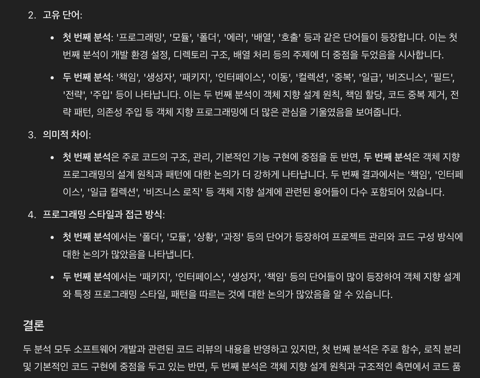 분석 결과 실제로 양측에서 코드리뷰에서 자주 등장하고 있는 키워드가 다른 것을 확인할 수 있었다.