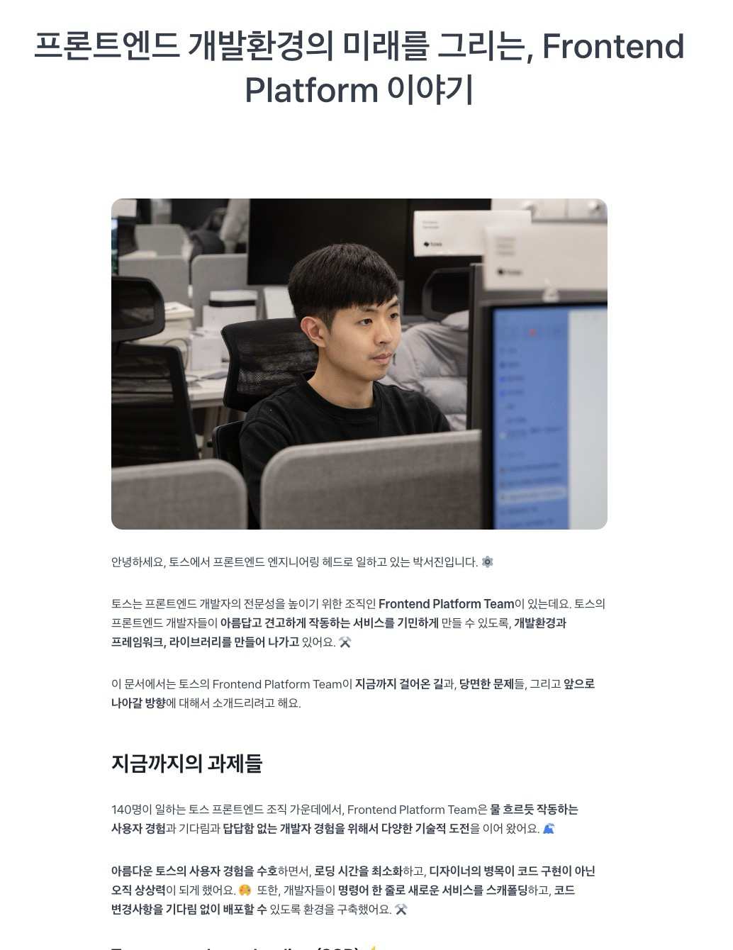 안녕하세요, 토스에서 프론트엔드 엔지니어링 헤드로 일하고 있는 박서진입니다. ⚙️토스는 프론트엔드 개발자의 전문성을 높이기 위한 조직인 Frontend Platform Team이 있는데요. 토스의 프론트엔